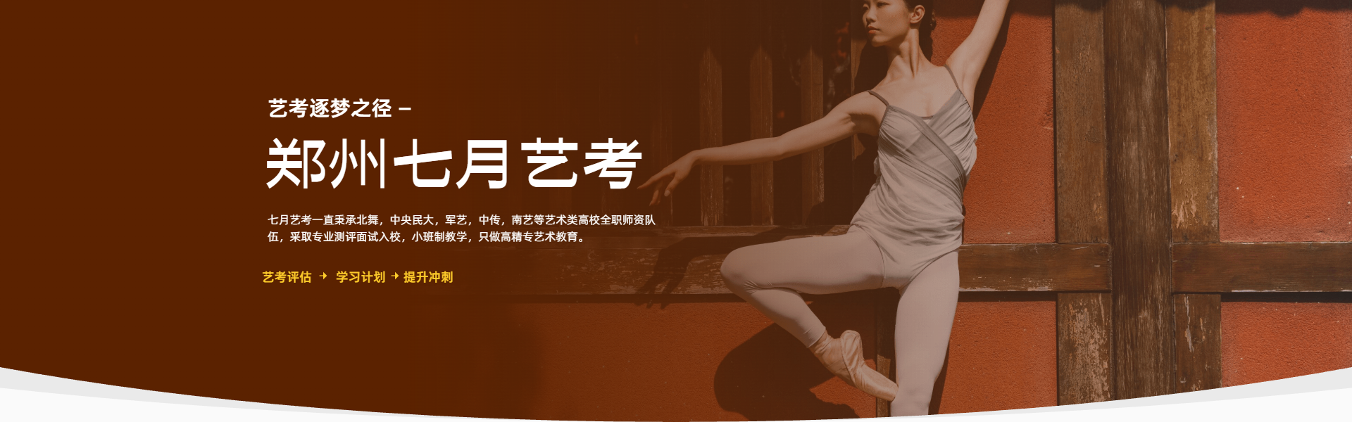 七月艺考专注于舞蹈艺术升学十五年,总部位于北京市海淀区,2018年郑州校区创立起,获得中央民大舞蹈表演全国第①,全国第②,舞蹈教育全国第⑥,第⑨,第⑪,第⑫,第⑲,中戏舞剧全国第③,河南省第①,天音舞表全国①,沈音舞蹈学全国第①、沈音舞表全国第④,全国第⑨等。河南省统考始终保持全员过关,本科率达到百分之九十五以上,成为全国学生优选艺考品牌。